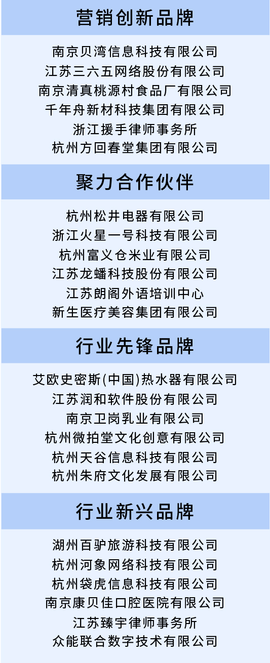 在百度品牌之夜活動上,根據(jù)數(shù)據(jù)趨勢、百度搜索熱度排名、行業(yè)影響,分別發(fā)布了營銷創(chuàng)新品牌、聚力合作伙伴、行業(yè)先鋒品牌、行業(yè)新興品牌等獎項,24家江浙品牌企業(yè)榮獲獎項,以鼓勵江浙品牌企業(yè)長遠發(fā)展。