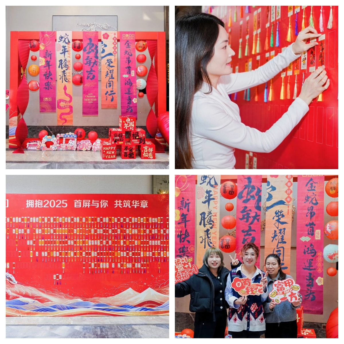 “平安喜樂”、“多財多億”、“諸事皆宜”等各色國風(fēng)箋條掛滿簽到墻,大家紛紛寫上祝福語,祈愿新年都有好運勢。另一邊,精致的新年打卡區(qū)吸引了伙伴們的目光,擺起Pose來上新年第一拍。